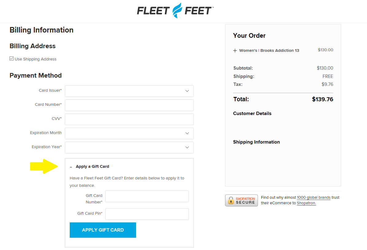 Gift cards can be redeemed online during checkout in the "Billing Information" section. Please click the "+" next to "Apply A Gift Card" to expand the section, and then enter your gift card number followed by the pin. Once the gift card is applied, your order total on the right will reflect the new balance. The image attached shows the expanded gift card section during check out.